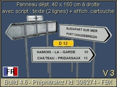 French directional road sign on the right 160x40 cm type D21 (2 lines) for departmental road. Destinations, with or without mileage as well as the addition of the little road sign with its number can be personalized (eg: NAME-CITY or NAME-CITY 7.5 / sign: D 123). VERSION 3 : NEW CORRECTED PBR TEXTURE - FBX/PBR Phiphitrainz 2023 3d object.