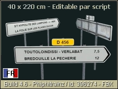 French directional road sign on the right 220x40 cm type D21 (2 lines) for departmental road. Destinations, with or without mileage as well as the addition of the little road sign with its number can be personalized (eg: NAME-CITY or NAME-CITY 7.5 / sign: D 123). FBX/PBR Phiphitrainz 2022 3d object.