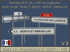 French directional road sign on the left 160x25 cm type D21 (1 line) for national road. The destination, with or without mileage as well as the addition of the little road sign with its number can be personalized (eg: NAME-CITY or 7.5 NAME-CITY / sign: D 123). VERSION 3 : NEW CORRECTED PBR TEXTURE - FBX/PBR Phiphitrainz 2023 3d object.