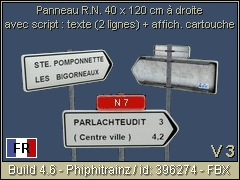 French directional road sign on the right 120x40 cm type D21 (2 lines) for national road. Destinations, with or without mileage as well as the addition of the little road sign with its number can be personalized (eg: NAME-CITY or NAME-CITY 7.5 / sign: D 123). VERSION 3 : NEW CORRECTED PBR TEXTURE - FBX/PBR Phiphitrainz 2023 3d object.