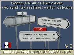 French directional road sign on the right 160x40 cm type D21 (2 lines) for national road. Destinations, with or without mileage as well as the addition of the little road sign with its number can be personalized (eg: NAME-CITY or NAME-CITY 7.5 / sign: D 123). VERSION 3 : NEW CORRECTED PBR TEXTURE - FBX/PBR Phiphitrainz 2023 3d object.