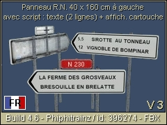 French directional road sign on the left 160x40 cm type D21 (2 lines) for national road. Destinations, with or without mileage as well as the addition of the little road sign with its number can be personalized (eg: NAME-CITY or 7.5 NAME-CITY / sign: D 123). VERSION 3 : NEW CORRECTED PBR TEXTURE - FBX/PBR Phiphitrainz 2023 3d object.