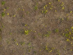 PBR environment ground texture. Sandy texture brown soil with yellow wild flowers.
