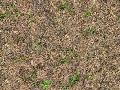 PBR environment ground texture. Brown soil with scattered green grass/weeds.