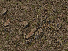 PBR environment ground texture. Brown sharp scatterd broken rocks and moss.