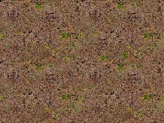 PBR environment texture. Forest ground with bare soil, pine cones, and patches of green weeds.