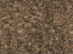 PBR environment ground texture. Semi-hard packed multi brown colored soil with scattered green leaves.