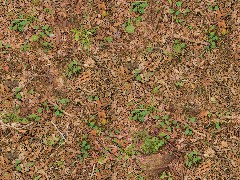 PBR environment ground texture. Red-brown soil, green weeds, brown weeds, dead leaves, and twigs.