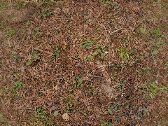 PBR environment ground texture. Red-Brown soil, green weed patches, twigs, and brown leaves.