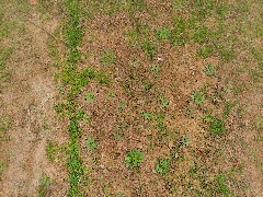 PBR environment ground texture. Red-Brown soil, green weed rows & patches.