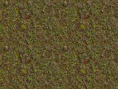 PBR environment texture. Forest ground with brown soil, grass patches, and fallen leaves.