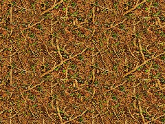 PBR environment texture. Forest ground with red-brown soil, geen plants, and twigs