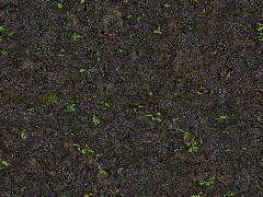PBR environment ground texture. Dark brown (black) dry soil with vegetation.