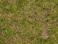 PBR environment ground texture. Patchy green/brown weeds and brown soil.