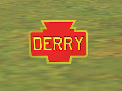 A Pennsylvania Railroad 'keystone type' station sign for the Derry station on the Main Line between Altoona and Pittsburgh. This station was located 68.9 railroad miles west of the Altoona PA station. There is a photo dated 1960 that shows a 'keystone type' station sign like this model on this station. Earlier photos show a 'plain style' sign on this station. I also made a 'plain type' sign for here, take your pick. NOTE: this PBR object is KIND mesh. It is intended to be used in conjunction with one or more attachment points on another object. The geometric center of this sign's back is where the attachment will occur. Based on PRR Drawing Number 58755, dated 1906.