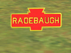 A Pennsylvania Railroad 'keystone type' station sign for the Radebaugh station on the Main Line between Altoona and Pittsburgh. This station was located 85.0 railroad miles west of the Altoona PA station. There is a photo dated 1960 that shows a 'keystone type' station sign like this model on this station. Earlier photos show a 'plain type' sign on this station. I also made a 'plain type' sign for here, take your pick. NOTE: this PBR object is a scenery (building) item. It can be used by placing it next to a building. Based on PRR Drawing Number 78160-A, dated 1928.