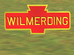 A Pennsylvania Railroad 'keystone type' station sign for the Wilmerding station on the Main Line between Altoona and Pittsburgh. This station was located 100.0 railroad miles west of the Altoona PA station. There is an undated photo that shows a 'keystone type' station sign like this model on this station. Earlier photos show a 'plain type' sign on this station. I also made a 'plain type' sign for here, take your pick. NOTE: this PBR object is a scenery (building) item. It can be used by placing it next to a building. Based on PRR Drawing Number 78160-A, dated 1928.