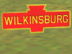 A Pennsylvania Railroad 'keystone type' station sign for the Wilkinsburg station on the Main Line between Altoona and Pittsburgh. This station was located 107.3 railroad miles west of the Altoona PA station. There is an undated photo that shows a 'keystone type' station sign like this model on this station. Earlier photos show a 'plain type' sign on this station. I also made a 'plain type' sign for here, take your pick. NOTE: this PBR object is a scenery (building) item. It can be used by placing it next to a building. Based on PRR Drawing Number 78160-A, dated 1928.