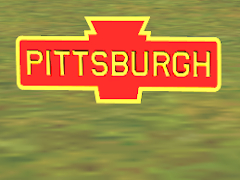 A Pennsylvania Railroad 'keystone type' station sign for the Pittsburgh station on the Main Line between Altoona and Pittsburgh. This station was located 113.8 railroad miles west of the Altoona PA station. NOTE: this PBR object is KIND mesh. It is intended to be used in conjunction with one or more attachment points on another object. The geometric center of this sign's back is where the attachment will occur. Based on PRR Drawing Number 78160-A, dated 1928.