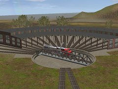 This is a 120 foot span through truss turntable of the Santa Fe design, with roundhouse, 17 storage tracks and two entrance tracks. The roundhouse has transparent windows and stationary doors fitted to the stalls, which are numbered.