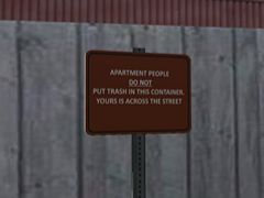 A sign telling apartment people to not put trash in this container but theirs that is across the street.