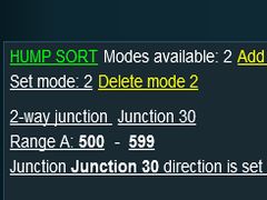 Modes greater than 4 are for Hump / Flat sorting but with different ranges specified. When several triggers are in use for flat sorting, all triggers operate in the same mode and must be set to the same unique channel number. When flat sorting, the locomotive remains coupled to the train. Special commands and assets are needed to stop the train under AI, decouple and return to the starting point. These have not yet been perfected. You may also refresh the name of the junction if it is not correct.