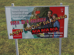 Panneau d'affichage de la Suisse Tourisme avec Roger Federer. Affiche taguée .