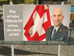 Plakat. Die Schweizer Armee sprengt ihren Haushalt um eine Milliarde / Okay, wir haben 1 Milliarde CHF verloren, aber scheiß auf dich!