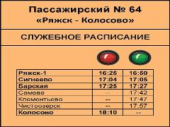 Schedule for Passenger train № 64 from Ryazhsk-1 to Kolosovo.