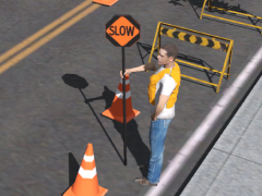 Roadwork job site flag man with hand-held STOP and SLOW sign; created in Makehuman, numerous imperfections; hi-poly model with only 2 LODs