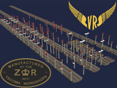 This set of VR 2 Position Somersault Semaphore signals covers a range of generic signals, including 3 different major mast types, various bracket and junction signals, and various disc and home signal combinations. Also included as some example of custom placed signals for specific yards (mostly those intended for the Healesville line). All junction signals are controlled by the 'Sig T' objects created by Bloodnok.