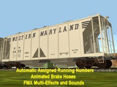 Accommodates CMTMSystem3 car destination system. Chicken Neck Foundry presents an animated 8 top hatch 2-Bay open side Covered Hopper with automatic assigned running numbers (thanks eldavo) and animated air brake hoses (thanks Wulf_9). The 8 top hatches open and close with load and unload sounds and dust flying at facilities like woodchips and interactive industries. Dust bellows from under the bays as the hopperunloads. Thanks bsnteng for fantastic assistance in editing hopper.gs script for automatic running numbers, brake air hoses, and couplers, and also thanks to Pencil42 aka Chris for fantastic assistance in editing previous hopper.gs script for the dust clouds at loading docks. . Thanks to Fitz505 for his prior assistance on hatch animation. Car has brake cylinders and couplers (thanks prjindigo) too. See more action and dust clouds loading at Auran industries. Created from the rails up with gmax Trainz Asset Creation Studio. Loads LARS and Auran products: barley, cement, corn, flour, grain hp, lose gravel, hops, limestone aggregate, malt, oats, peas, plaster, granular plastic, quartz sand, rice, sand, sand and gravel, soda ash, soya beans, sugar, taconite pellets, wheat, or woodchips. Employees cloakedghost275 bogies.