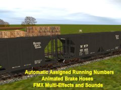 Accommodates CMTMSystem3 car destination system. Chicken Neck Foundry presents an animated 8 top hatch 2-Bay open side Covered Hopper with automatic assigned running numbers (thanks eldavo) and animated air brake hoses (thanks Wulf_9). The 8 top hatches open and close with load and unload sounds and dust flying at facilities like woodchips and interactive industries. Dust bellows from under the bays as the hopperunloads. Thanks bsnteng for fantastic assistance in editing hopper.gs script for automatic running numbers, brake air hoses, and couplers, and also thanks to Pencil42 aka Chris for fantastic assistance in editing previous hopper.gs script for the dust clouds at loading docks. . Thanks to Fitz505 for his prior assistance on hatch animation. Car has brake cylinders and couplers (thanks prjindigo) too. See more action and dust clouds loading at Auran industries. Created from the rails up with gmax Trainz Asset Creation Studio. Loads LARS and Auran products: barley, cement, corn, flour, grain hp, lose gravel, hops, limestone aggregate, malt, oats, peas, plaster, granular plastic, quartz sand, rice, sand, sand and gravel, soda ash, soya beans, sugar, taconite pellets, wheat, or woodchips. Employees cloakedghost275 bogies.