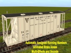 Chicken Neck Foundry presents a 2-bay airslide hopper. Looking more like a boxcar than a hopper, airslides where first introduced in 1954 by General American Transporation Corporation like this one. They feature a finely perforated interior fabric lining. The powdered or granulated load of usually flour or sugar is effectively liquified as it is forced out of the car under high air pressure via hose connections. It is also used to carry grains and other fine products. This early C111 39 ft model hopper's top hatches open and close with load and unload sounds and additional dust clouds at facilities like woodchips and with automatic assigned running numbers (thanks eldavo) and animated air brake hoses (thanks Wulf_9).. While usually dust free, this car also bellows clouds of it from under the bays as the hopper unloads. Thanks to Pencil42, Fitz505 and PhilC (his handles and couplers), whose assistance on prior type hoppers and cars made this one possible. Car has brake cylinder and reservoir, and couplers too. Created from the rails up with gmax Trainz Asset Creation Studio. Loads LARS and Auran products: barley, cement, corn, flour, grain hp, lose gravel, hops, limestone aggregate, malt, oats, peas,plaster, granular plastic, quartz sand, rice, sand, sand and gravel, soda ash, soya beans, sugar, taconite pellets, wheat, or woodchips. Note: Some are not appropriate for this type car. Employees roller bearing trucks by CloakedGhost275.