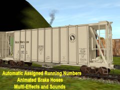 Chicken Neck Foundry presents a 2-bay airslide hopper. Looking more like a boxcar than a hopper, airslides where first introduced in 1954 by General American Transporation Corporation like this one. They feature a finely perforated interior fabric lining. The powdered or granulated load of usually flour or sugar is effectively liquified as it is forced out of the car under high air pressure via hose connections. It is also used to carry grains and other fine products. This early C111 39 ft model hopper's top hatches open and close with load and unload sounds and additional dust clouds at facilities like woodchips and with automatic assigned running numbers (thanks eldavo) and animated air brake hoses (thanks Wulf_9).. While usually dust free, this car also bellows clouds of it from under the bays as the hopper unloads. Thanks to Pencil42, Fitz505 and PhilC (his handles and couplers), whose assistance on prior type hoppers and cars made this one possible. Car has brake cylinder and reservoir, and couplers too. Created from the rails up with gmax Trainz Asset Creation Studio. Loads LARS and Auran products: barley, cement, corn, flour, grain hp, lose gravel, hops, limestone aggregate, malt, oats, peas,plaster, granular plastic, quartz sand, rice, sand, sand and gravel, soda ash, soya beans, sugar, taconite pellets, wheat, or woodchips. Note: Some are not appropriate for this type car. Employees roller bearing trucks by CloakedGhost275.