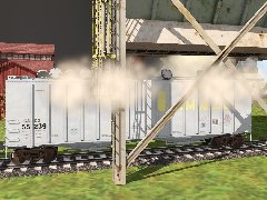 Chicken Neck Foundry presents a 2-bay airslide hopper. Looking more like a boxcar than a hopper, airslides where first introduced in 1954 by General American Transporation Corporation. They feature a finely perforated interior fabric lining. The powdered or granulated load of usually flour or sugar is effectively liquified as it is forced out of the car under high air pressure via hose connections. It is also used to carry grains and other fine products. This later 48 ft model hopper's top hatches open and close with load and unload sounds and additional dust clouds at facilities like woodchips and with automatic assigned running numbers (thanks eldavo) and animated air brake hoses (thanks Wulf_9).. While usually dust free, this car also bellows clouds of it from under the bays as the hopper unloads. Thanks to Pencil42, Fitz505 and PhilC (his handles and couplers), whose assistance on prior type hoppers and cars made this one possible. Car has brake cylinder and reservoir, and couplers too. Created from the rails up with gmax Trainz Asset Creation Studio. Loads LARS and Auran products: barley, cement, corn, flour, grain hp, lose gravel, hops, limestone aggregate, malt, oats, peas, plaster, granular plastic, quartz sand, rice, sand, sand and gravel, soda ash, soya beans, sugar, taconite pellets, wheat, or woodchips. Note: Some are not appropriate for this type car. Employees roller bearing trucks by CloakedGhost275.