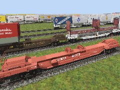 The Flexi-Van Mark 4 was introduced in 1964 and only carried 40ft trailers on end turntables and was 87ft-3in and had higher capacity trucks located closer to the center of the flatcar. (Note:Flexi-Van Mark 3 Flatcar was introduced in 1961 and only carried 40ft trailers on end turntables and was 86ft-9in in length, with the trucks directly under the end turntables). Has automatic assigned running numbers, and animated brake air hoses with sound. Thanks Wulf_9 for animated brake hoses. Many thanks to p-dehnert for script editing to permit the use of two script files