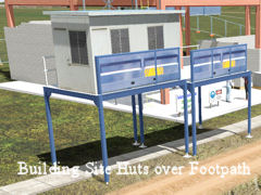 A site hut for a building construction site, mounted over a footpath to allow pedestrian access but not intrude on the work site, single bay, hut included. In some of my scenery models I have included attached figures to make them more interesting. If you do not want the figures to show, remove the effects container in the config file.
