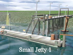 A small jetty for ships or fishing, this is a scenery object, with detailed additions, crates, drums, a fisherman, a dock crane and night lights. It is designed to be placed on ground, so that the water level is 3 metres below the ground level.