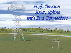 A 500 KV high tension Power Line spline, modular length 300 metres with terminator for connection to a power station. Make sure the ground under the wires is level or on a straight slope or the wires will be distorted. Use the Smooth Spline Tool from the menu on the model spline to achieve this.