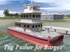 A tugboat as a pusher craft for work barges, 22 metres by 8 metres for shipping cargo and large loads, static model. In some of my scenery models I have included attached figures to make them more interesting. If you do not want the figures to show, remove the effects container in the config file.