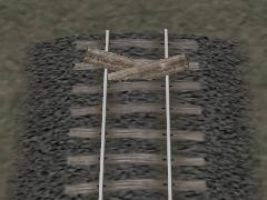 Crossed ties wheel stop or track end for 3 foot gauge track. This Trainz object will function to stop a train at up to 5 mph.