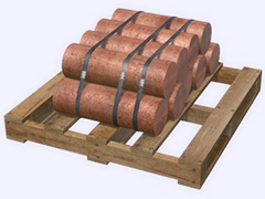 A pallet-mounted pile of 9 cleaned copper billets, bound with metal straps.