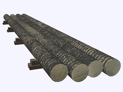 A skid-mounted row of 4 unbound cast brass billets, 4m long, 200mm diameter.
