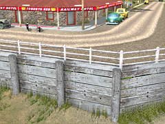 It is a timber retaining wall with a ground plane on top matching my Gravel 01 DR groundtexture and supported by timber posts. Repeating sections are 4m long, LOD polycounts are 46, 28, 12 triangles, culled at a nominal 4000m. 2 materials per mesh. Made for Michael Sutton (sirgibby) in 3DS Max 2009.
