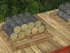 A pile of 9 acid-washed brass billets, secured with metal straps on a pine wood pallet. There are 2 similar loads rendered at random.
