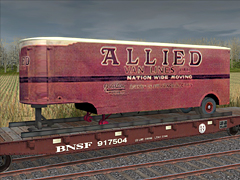 A single 35ft Fruehauf trailer in Allied livery. It is equipped with a TOFC hitch and stabilising rails making it suitable for use on plain flatcars able to handle 40ft containers.