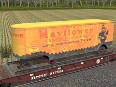 A single 35ft Fruehauf trailer in Mayflower livery. It is equipped with a TOFC hitch and stabilising rails making it suitable for use on plain flatcars able to handle 40ft containers.