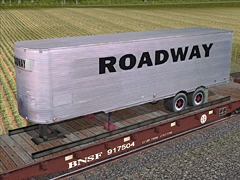 A single 35ft Fruehauf trailer in Roadway livery. It is equipped with a TOFC hitch and stabilising rails making it suitable for use on plain flatcars able to handle 40ft containers.