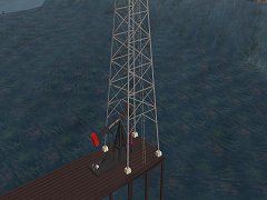 A Churchill Balance Beam Oil Pumping Unit B=Black with a metal derrick. This unit is setting on a platform that can be used on or off shore.